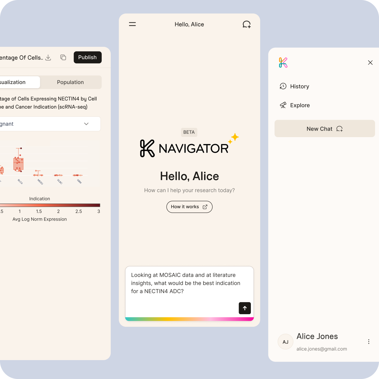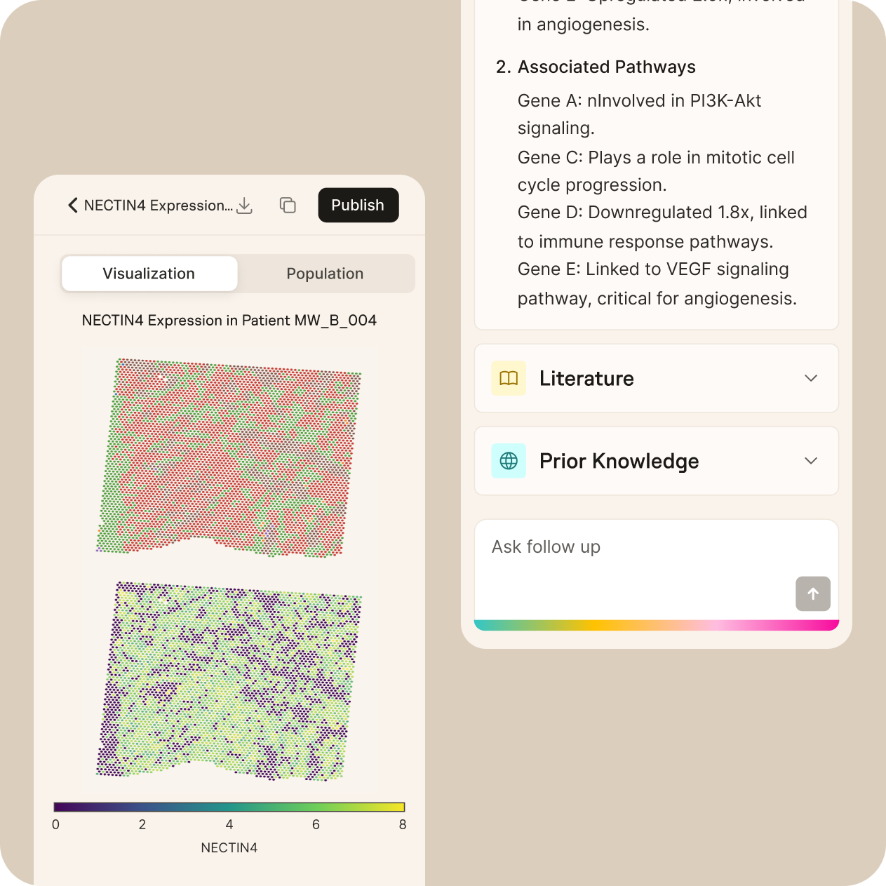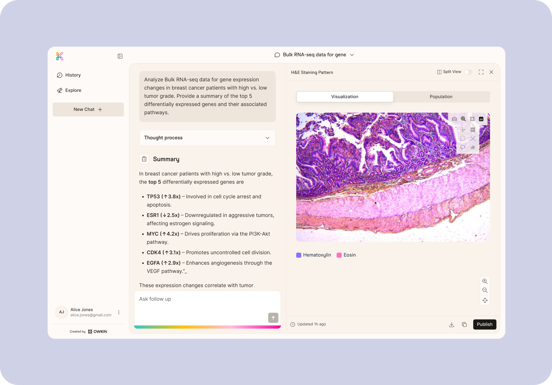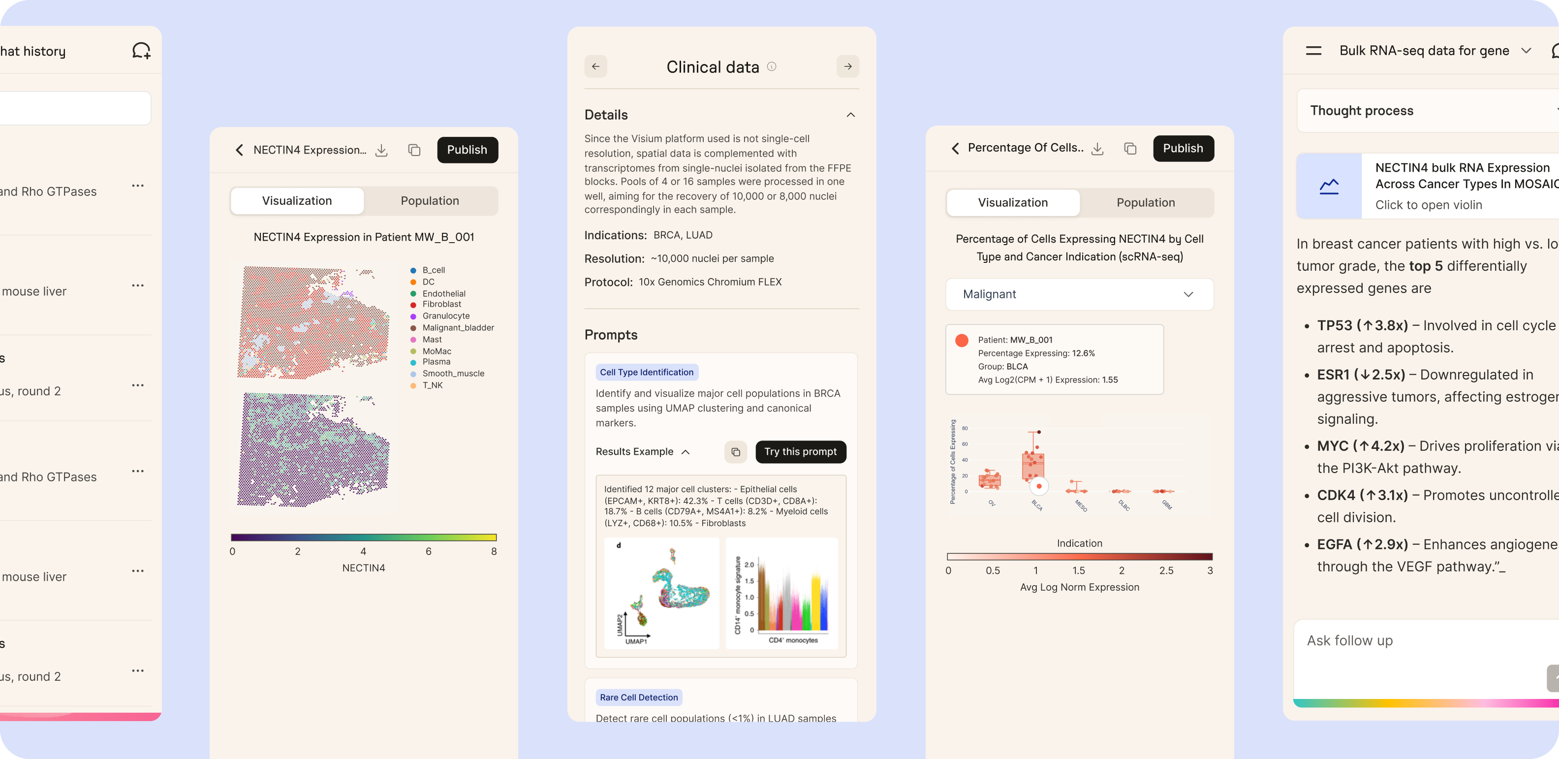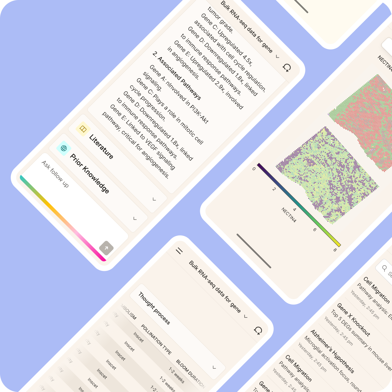 For this project, our team has provided a full UI/UX solution featuring AI-powered chat interfaces, interactive data visualizations, and transparent AI reasoning panels. We were able to translate complex scientific workflows into an approachable platform for non-coding biologists while preserving rigorous data detail. As a result, the users of the platform are satisfied with the interface and are able to focus more on hypothesis testing rather than dealing with technical issues.